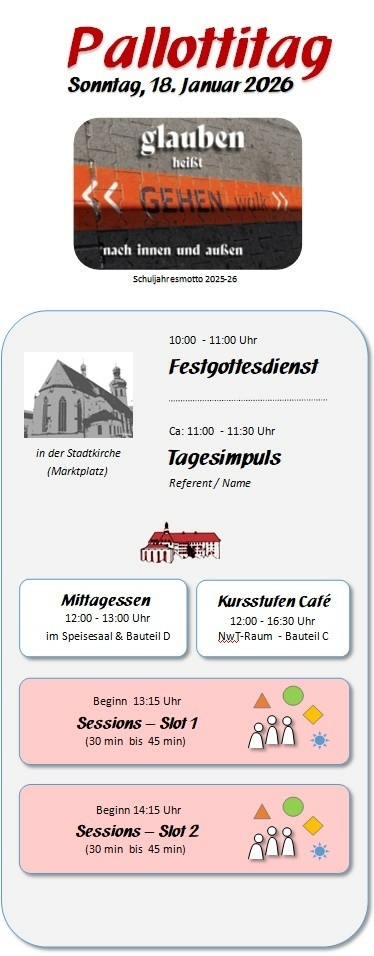 Die genauen Veranstaltungsräume entnehmen Sie dann bitte am Pallottitag den Aushängen.
