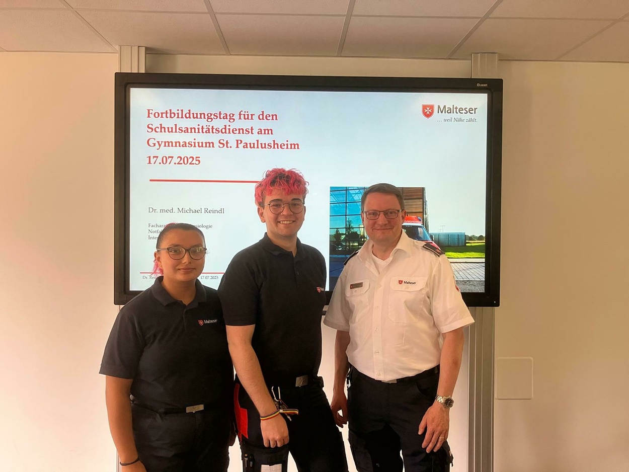 Ein ganz besonderer Dank gilt den Maltesern unter der Leitung von Dr. Reindl sowie seinen beiden Helfern Celine Woll und Alexander Vetter (beide ehemalige Schüler unseres Gymnasiums), die mit großem Engagement und Fachwissen durch den Workshop führten, um ihr Können mit den Jugendlichen zu teilen und ihnen einen direkten Einblick in die Praxis zu ermöglichen.