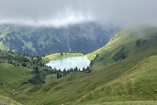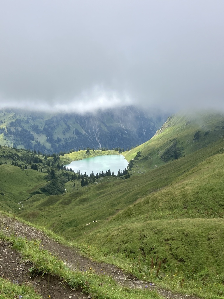 Statt bis zum Bodensee schauen zu können, lag unsere Sichtweite etwa bei zwei Metern. Trotz allem konnte uns der Vortrag unserer netten Bergführerin begeistern und wir machten eine kleine Wanderung etwa auf halber Höhe des Nebelhorns. Der „Wettergott“ meinte es jedoch zwischendurch gut mit uns und so konnten wir neben unzähligen Kühen und dem Tal sogar einen Karsee, den Seealpsee, bewundern. Zum Abschluss des Tages machten wir ein Lagerfeuer mit Stockbrot und Marshmallows.